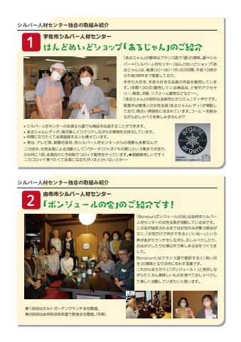 %u30b7%u30eb%u30d0%u30fc%u4eba%u6750%u30bb%u30f3%u30bf%u30fc%u72ec%u81ea%u306e%u53d6%u7d44%u307f%u7d39%u4ecb%u5b87%u4f50%u5e02%u30b7%u30eb%u30d0%u30fc%u4eba%u6750%u30bb%u30f3%u30bf%u30fc 1 %u306f%u3093%u3069%u3081%u3044%u3069%u30b7%u30e7%u30c3%u30d7%u300c%u3042%u308b%u3058%u3083%u3093%u300d%u306e%u3054%u7d39%u4ecb%u300c%u3042%u308b%u3058%u3083%u3093%u300d%u306e%u610f%u5473%u306f%u30d5%u30e9%u30f3%u30b9%u8a9e%u3067%u300c%u9280%u300d%u306e%u610f%u5473%u3002%u9280%u21d2%u30b7%u30eb%u30d0%u30fc%u21d2%u300c%u30b7%u30eb%u30d0%u30fc%u4eba%u6750%u30bb%u30f3%u30bf%u30fc%u300d%u306f%u3093%u3069%u3081%u3044%u3069%u30b7%u30e7%u30c3%u30d7%u300c%u3042%u308b%u3058%u3083%u3093%u300d%u306f%u3001%u6bce%u9031%uff08%u706b%uff09%u30fb%uff08%u6c34%uff09%u30fb%uff08%u6728%uff09%u306e3%u65e5%u9593%u3001%u5348%u524d10%u6642%u304b%u3089%u5348%u5f8c3%u6642%u534a%u307e%u3067%u55b6%u696d%u3057%u3066%u304a%u308a%u3001%u624b%u4f5c%u308a%u5927%u597d%u304d%u3001%u624b%u82b8%u5927%u597d%u304d%u306a%u4f1a%u54e1%u306e%u4f5c%u54c1%u3092%u8ca9%u58f2%u3057%u3066%u3044%u307e%u3059%u3002%uff08%u5e74%u9593130%u65e5%uff09%u8ca9%u58f2%u3057%u3066%u3044%u308b%u5546%u54c1%u306f%u3001%u5c0f%u7269%u3084%u30a2%u30af%u30bb%u30b5%u30ea%u30fc%u3001%u9676%u82b8%u3001%u6d0b%u670d%u3001%u30ea%u30d5%u30a9%u30fc%u30e0%u7740%u7269%u306a%u3069%u306a%u3069%u30fb%u30fb%u30fb%u3002%u300c%u3042%u308b%u3058%u3083%u3093%u300d%u306e%u76ee%u7684%u306f%u4f1a%u54e1%u540c%u58eb%u306e%u30b3%u30df%u30e5%u30cb%u30c6%u30a3%u4f5c%u308a%u3067%u3059%u3002%u55b6%u696d%u4e2d%u306f%u7ba1%u7406%u4eba%u306e%u5973%u6027%u4f1a%u54e1%uff08%u3042%u308b%u3058%u3083%u3093%u30ec%u30c7%u30a3%uff09%u304c%u5e38%u99d0%u3057%u3066%u304a%u308a%u3001%u660e%u308b%u3044%u96f0%u56f2%u6c17%u306b%u5305%u307e%u308c%u3066%u3044%u307e%u3059%u3002%u30b3%u30fc%u30d2%u30fc%u3092%u98f2%u307f%u306a%u304c%u3089%u304a%u3057%u3083%u3079%u308a%u3092%u697d%u3057%u307f%u307e%u305b%u3093%u304b%uff1f%u3053%u306e%u307b%u304b%u3001%u5973%u6027%u4f1a%u54e1%u306b%u3088%u308b%u6d3b%u52d5%u3068%u3057%u3066%u300c%u30d1%u30bf%u30fc%u30bf%uff08%u30b8%u30e3%u30ac%u30a4%u30e2%u306e%u610f%uff09%u300d%u3068%u3044%u3046%u96c6%u307e%u308a%u304c%u3042%u308a%u30012%u304b%u6708%u306b1%u56de%u3001%u4f1a%u54e1%u5411%u3051%u306b%u4e88%u7d04%u5236%u3067%u30b3%u30ed%u30c3%u30b1%u8ca9%u58f2%u3092%u884c%u3063%u3066%u3044%u307e%u3059%u3002%u2605%u8d85%u7d76%u7f8e%u5473%u3057%u3044%u3067%u3059%u203c%u3053%u306e%u30b3%u30ed%u30c3%u30b1%u98df%u3079%u305f%u304f%u3066%u4f1a%u54e1%u306b%u306a%u308b%u65b9%u304c%u3044%u308b%u3068%u304b%u3044%u306a%u3044%u3068%u304b%u30fb%u30fb%u30fb%u3000%u3000%u3000%u2022 %u30b7%u30eb%u30d0%u30fc%u4eba%u6750%u30bb%u30f3%u30bf%u30fc%u306e%u4f1a%u54e1%u306a%u3089%u8ab0%u3067%u3082%u5546%u54c1%u3092%u51fa%u54c1%u3059%u308b%u3053%u3068%u304c%u3067%u304d%u307e%u3059%u3002%u2022 %u3042%u308b%u3058%u3083%u3093%u30ec%u30c7%u30a3%u304c%u3001%u6bce%u65e5%u697d%u3057%u304f%u30ef%u30af%u30ef%u30af%u3057%u306a%u304c%u3089%u304a%u5ba2%u69d8%u3092%u304a%u5f85%u3061%u3057%u3066%u3044%u307e%u3059%u3002%u2022 %u4ef2%u9593%u306b%u306a%u308a%u305f%u304f%u3066%u4f1a%u54e1%u767b%u9332%u3059%u308b%u4eba%u3082%u5897%u3048%u3066%u3044%u307e%u3059%u3002%u2022 %u5b9f%u306f%u3001%u30c6%u30ec%u30d3%u5c40%u3001%u65b0%u805e%u793e%u53d6%u6750%u3001%u4ed6%u30b7%u30eb%u30d0%u30fc%u4eba%u6750%u30bb%u30f3%u30bf%u30fc%u304b%u3089%u306e%u8996%u5bdf%u3082%u591a%u6570%u306a%u3093%u3067%u7b2c1%u56de%u76ee%u306f%u30db%u30eb%u30c8%u30ac%u30fc%u30c7%u30f3%u3067%u30e9%u30f3%u30c1%u4f1a%u3092%u958b%u50ac%u3002%u7b2c2%u56de%u76ee%u306f%u7531%u5e03%u9662%u7518%u5473%u8336%u5c4b%u3067%u663c%u98df%u4f1a%u3092%u958b%u50ac%u3002%uff08%u5199%u771f%uff09%u300cBonjour(%u30dc%u30f3%u30b8%u30e5%u30fc%u30eb)%u306e%u4f1a%u300d%u306f%u7531%u5e03%u5e02%u30b7%u30eb%u30d0%u30fc%u4eba%u6750%u30bb%u30f3%u30bf%u30fc%u306e%u5973%u6027%u4f1a%u54e1%u304c%u6d3b%u52d5%u3057%u3066%u3044%u308b%u4f1a%u3067%u3059%u3002%u3053%u306e%u4f1a%u304c%u7d50%u6210%u3055%u308c%u308b%u307e%u3067%u306f%u5973%u6027%u306e%u307f%u304c%u96c6%u3046%u90e8%u4f1a%u304c%u306a%u304f%u3001%u300c%u5973%u6027%u3060%u3051%u3067%u4f55%u304b%u3067%u304d%u308b%u3068%u3044%u3044%u306d%uff5e%u300d%u3068%u3044%u3046%u58f0%u304c%u3042%u304c%u308a%u30e9%u30f3%u30c1%u3092%u3057%u306a%u304c%u3089%u3001%u304a%u3057%u3083%u3079%u308a%u3057%u305f%u308a%u3001%u304a%u51fa%u304b%u3051%u3057%u305f%u308a%u4ed5%u4e8b%u4ee5%u5916%u3067%u697d%u3057%u3081%u308b%u4f1a%u3092%u3064%u304f%u308a%u307e%u3057%u305f%u3002Bonjour%u3068%u306f%u30d5%u30e9%u30f3%u30b9%u8a9e%u3067%u76f4%u8a33%u3059%u308b%u3068%u300c%u826f%u3044%u65e5%u3092%u300d%u306e%u610f%u5473%u3068%u306a%u308a%u65e5%u4e2d%u306b%u4ea4%u308f%u3059%u8a00%u8449%u3067%u3059%u3002%u3053%u308c%u304b%u3089%u4f1a%u3046%u65b9%u3005%u3068%u300c%u30dc%u30f3%u30b8%u30e5%u30fc%u30eb%uff01%u300d%u3068%u6328%u62f6%u3057%u306a%u304c%u3089%u305f%u304f%u3055%u3093%u7f8e%u5473%u3057%u3044%u3082%u306e%u3092%u98df%u3079%u3066%u304a%u3057%u3083%u3079%u308a%u3057%u3066%u697d%u3057%u304f%u6d3b%u52d5%u3057%u3066%u3044%u304d%u305f%u3044%u3068%u601d%u3044%u307e%u3059%u3002%u30b7%u30eb%u30d0%u30fc%u4eba%u6750%u30bb%u30f3%u30bf%u30fc%u72ec%u81ea%u306e%u53d6%u7d44%u307f%u7d39%u4ecb%u7531%u5e03%u5e02%u30b7%u30eb%u30d0%u30fc%u4eba%u6750%u30bb%u30f3%u30bf%u30fc 2 %u300c%u30dc%u30f3%u30b8%u30e5%u30fc%u30eb%u306e%u4f1a%u300d%u306e%u3054%u7d39%u4ecb%u3067%u3059%uff01